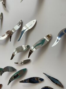 The sculptures are created out of industrial marine quality materials that suggest movement, reflection and weightlessness.