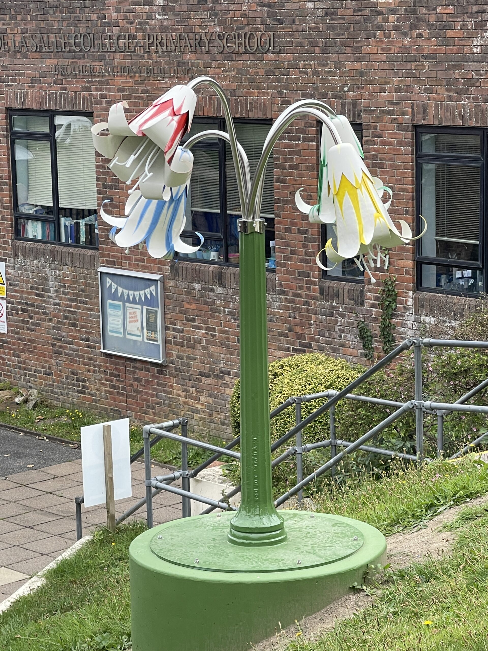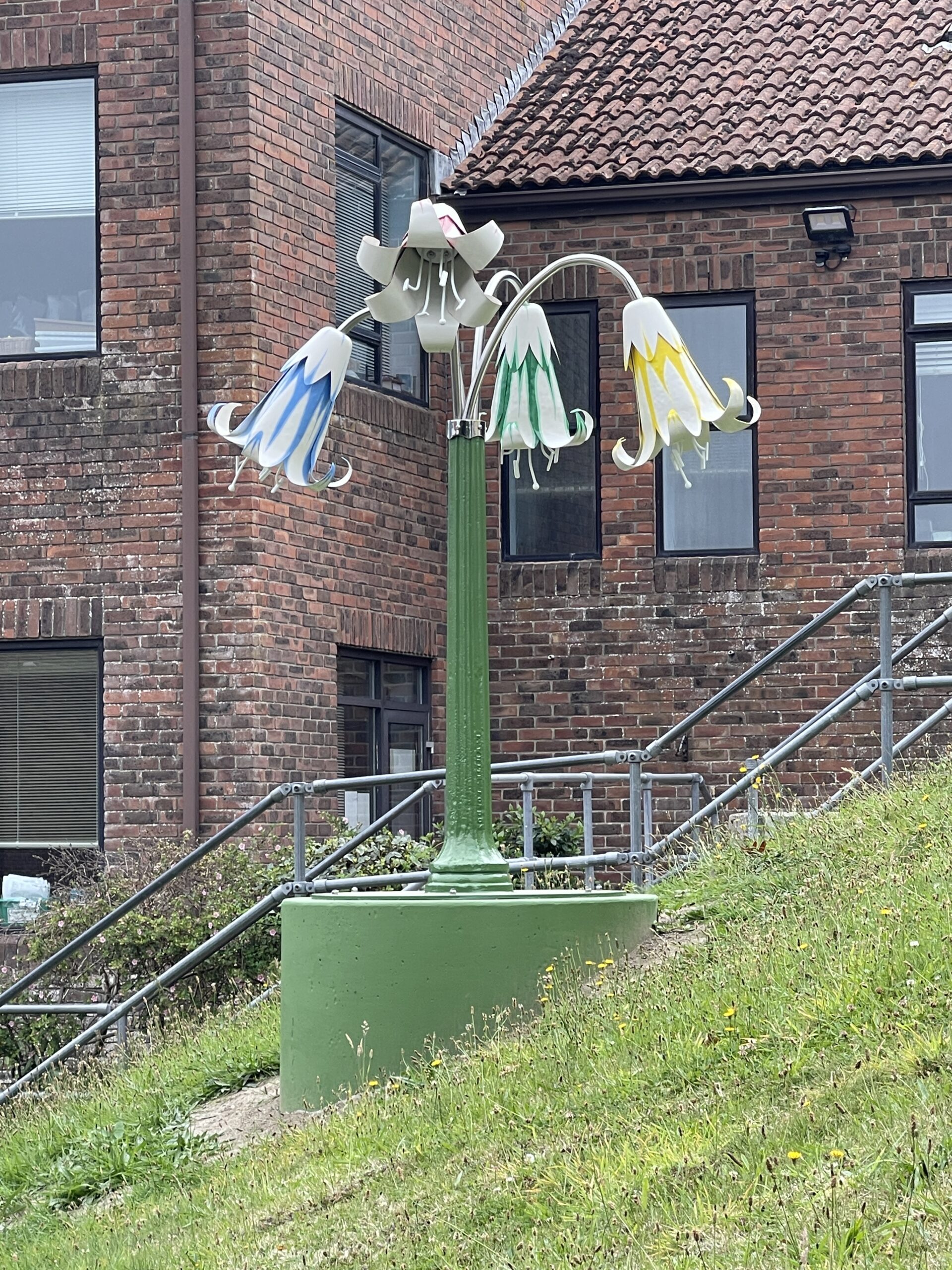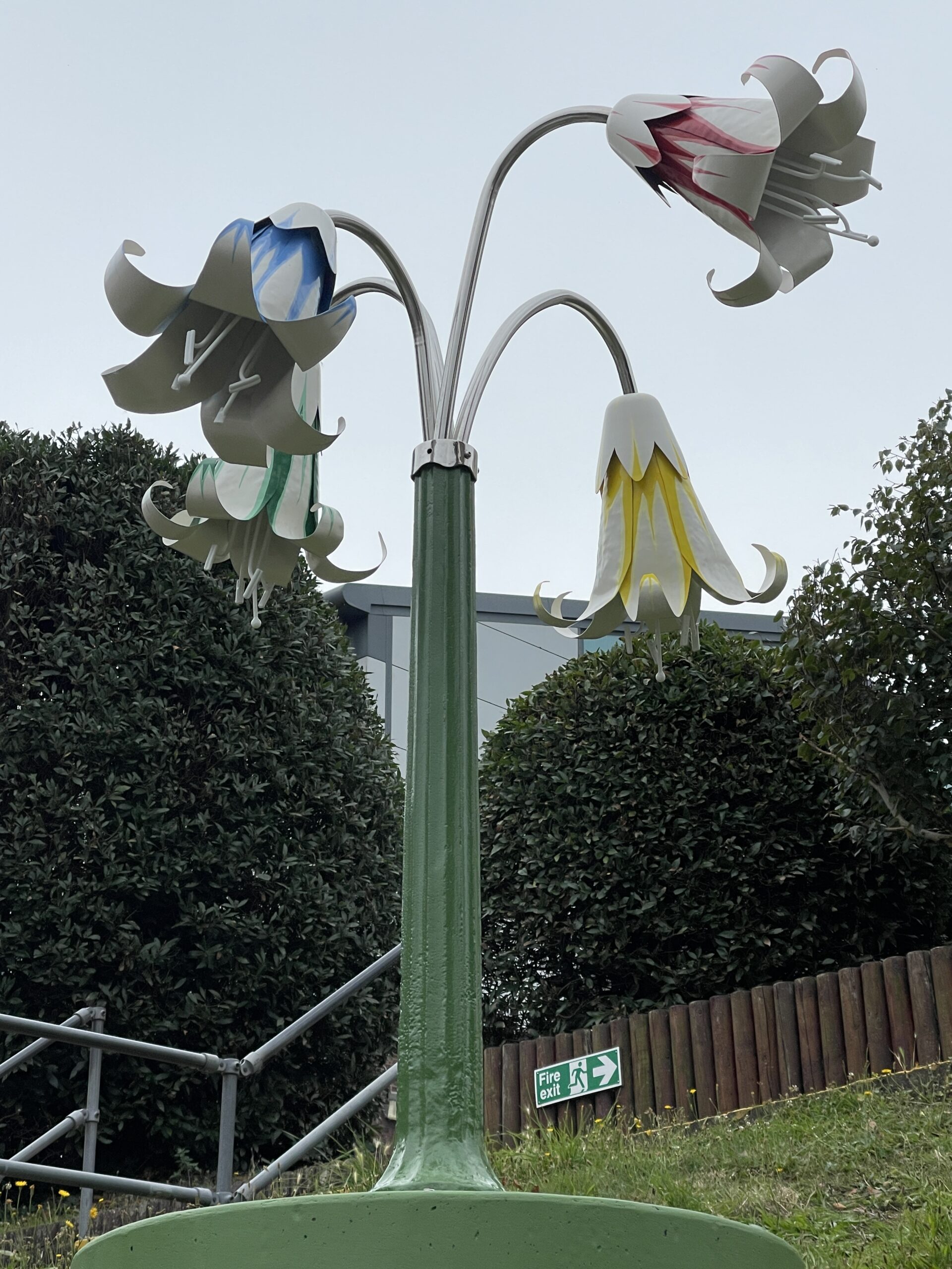 Recycled telegraph pole, painted copper flowers, stainless steel tubs and LED lighting