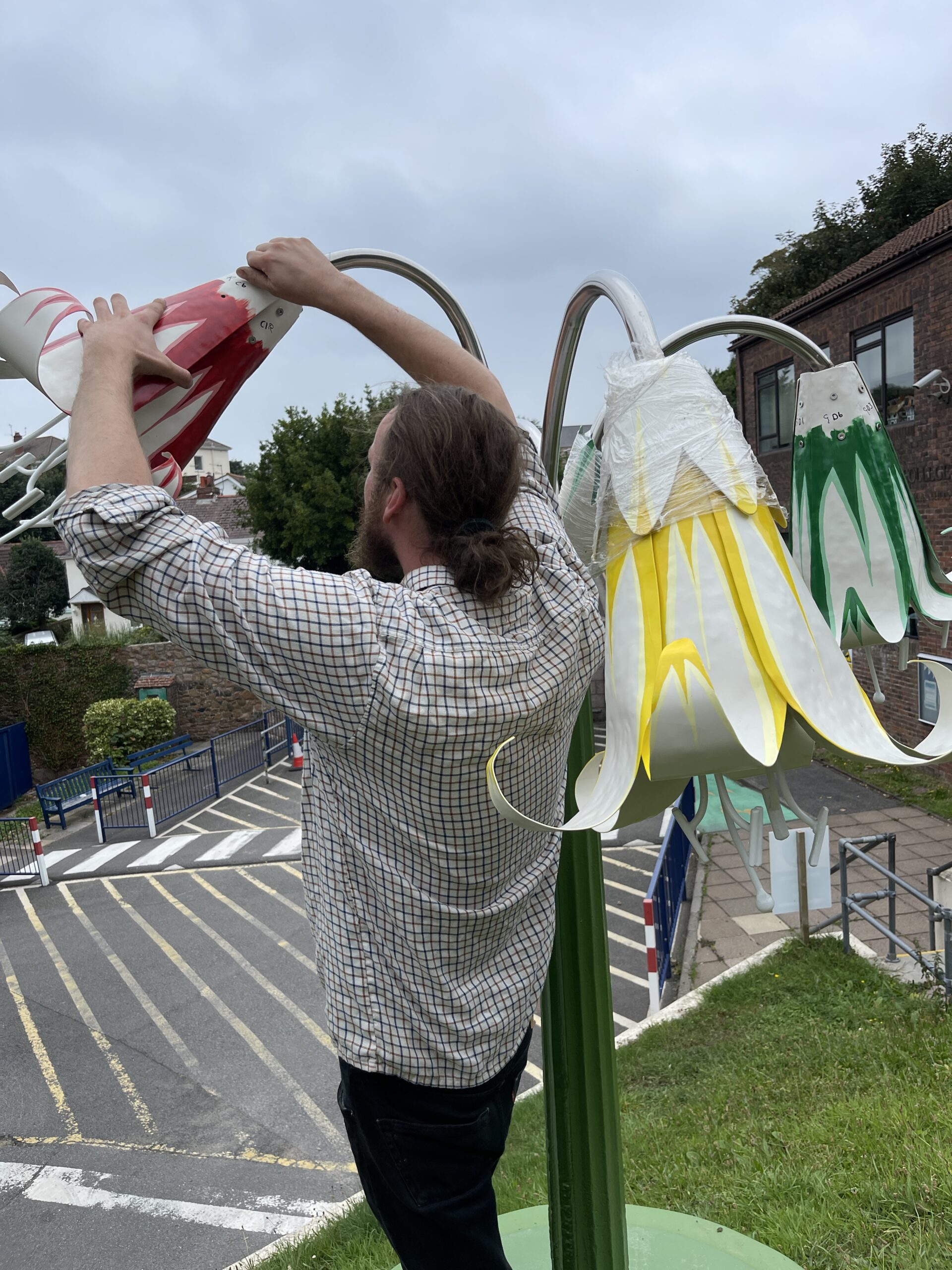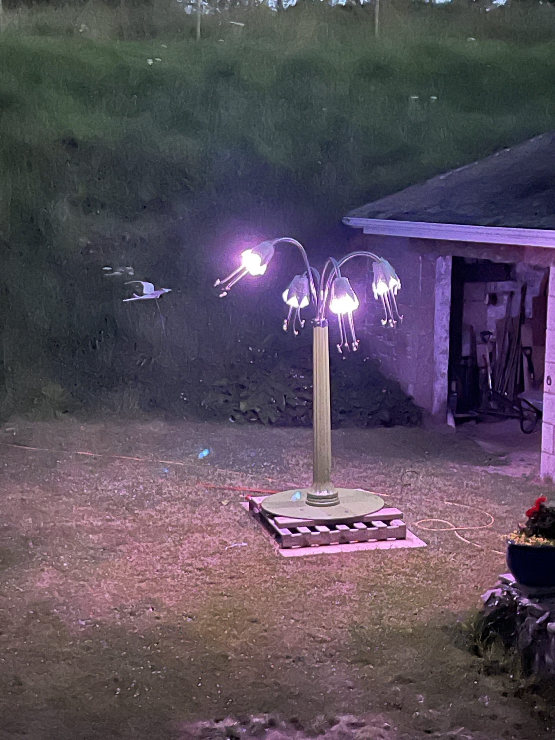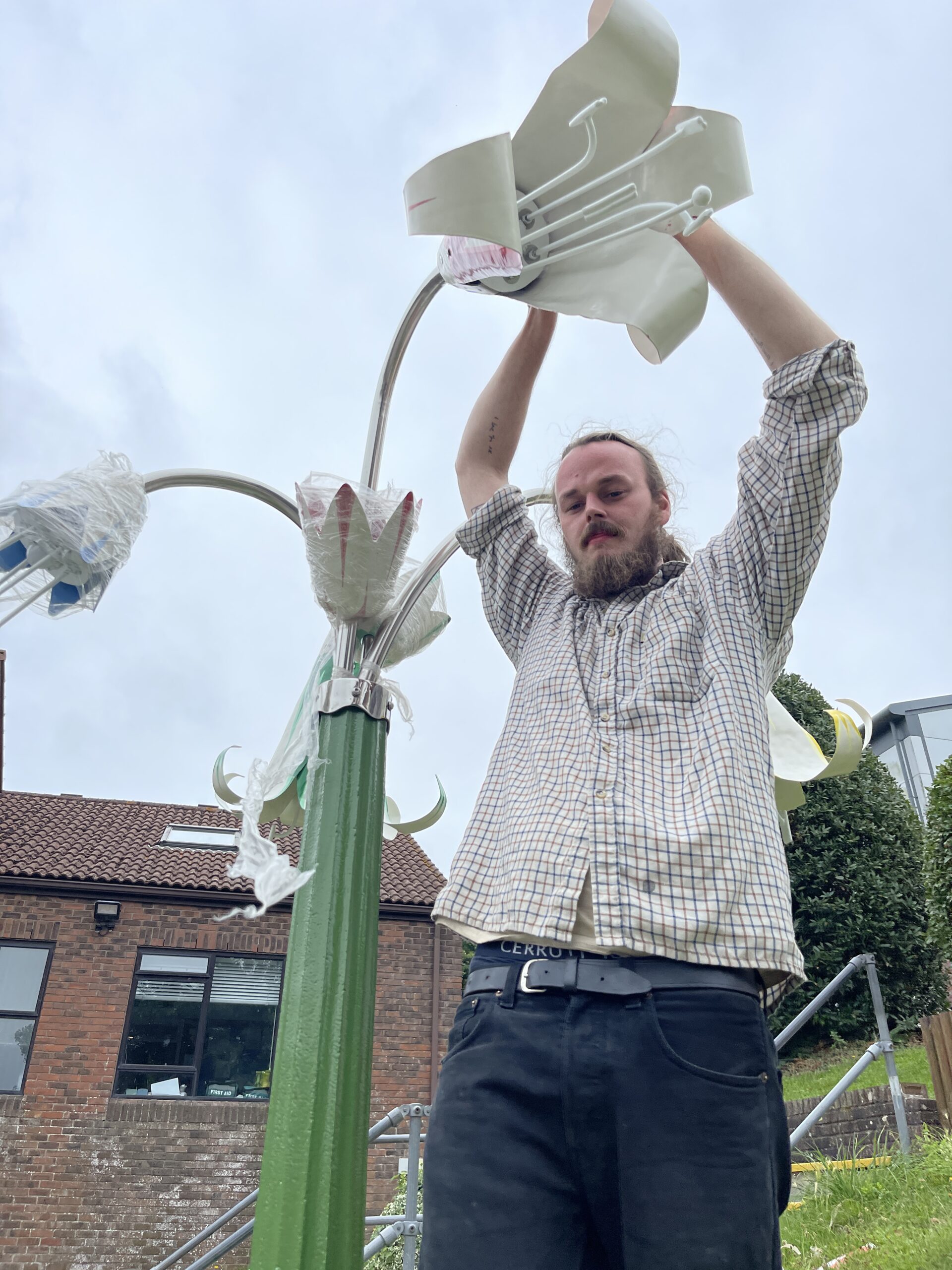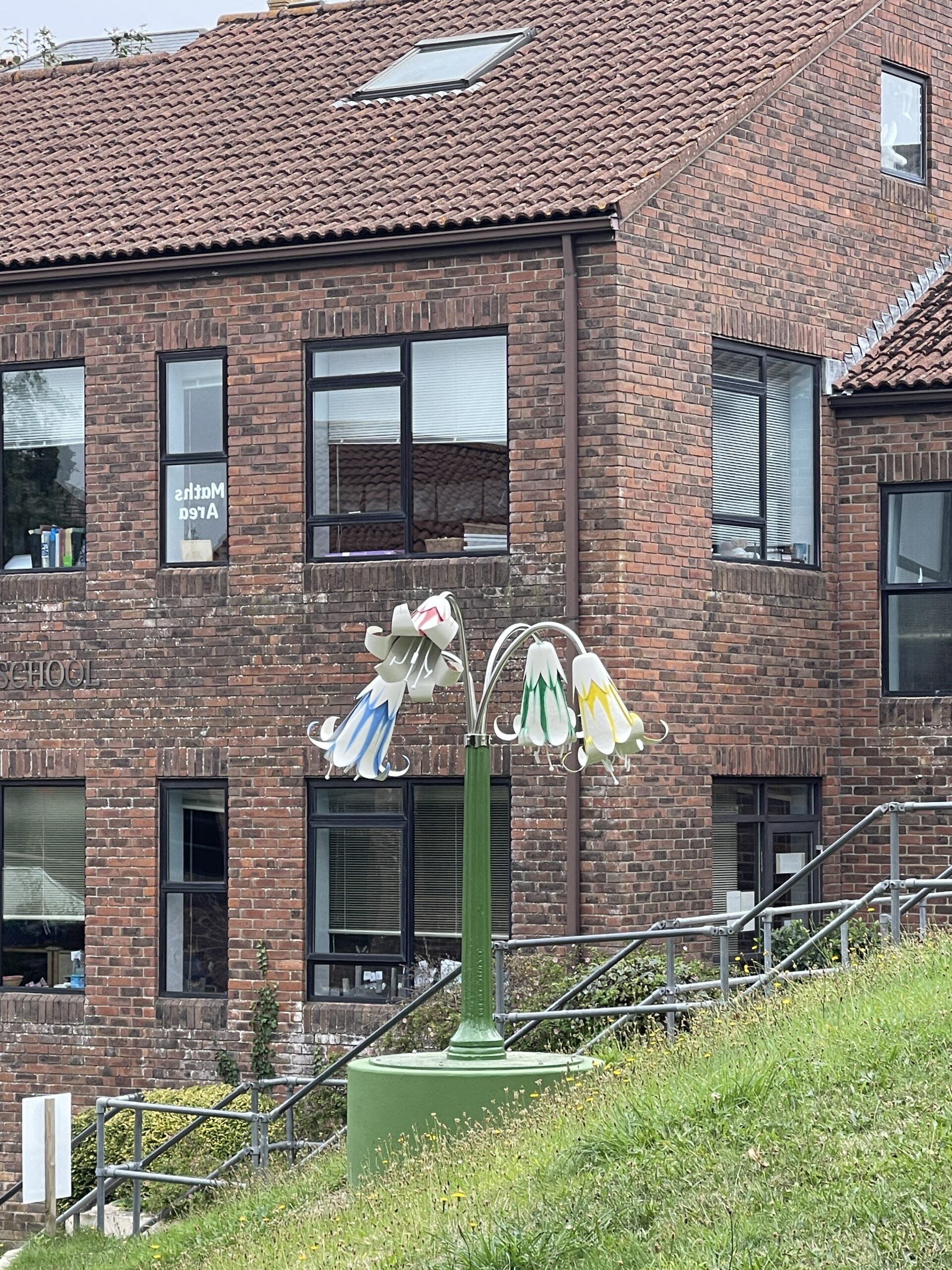 Recycled telegraph pole, painted copper flowers, stainless steel tubs and LED lighting